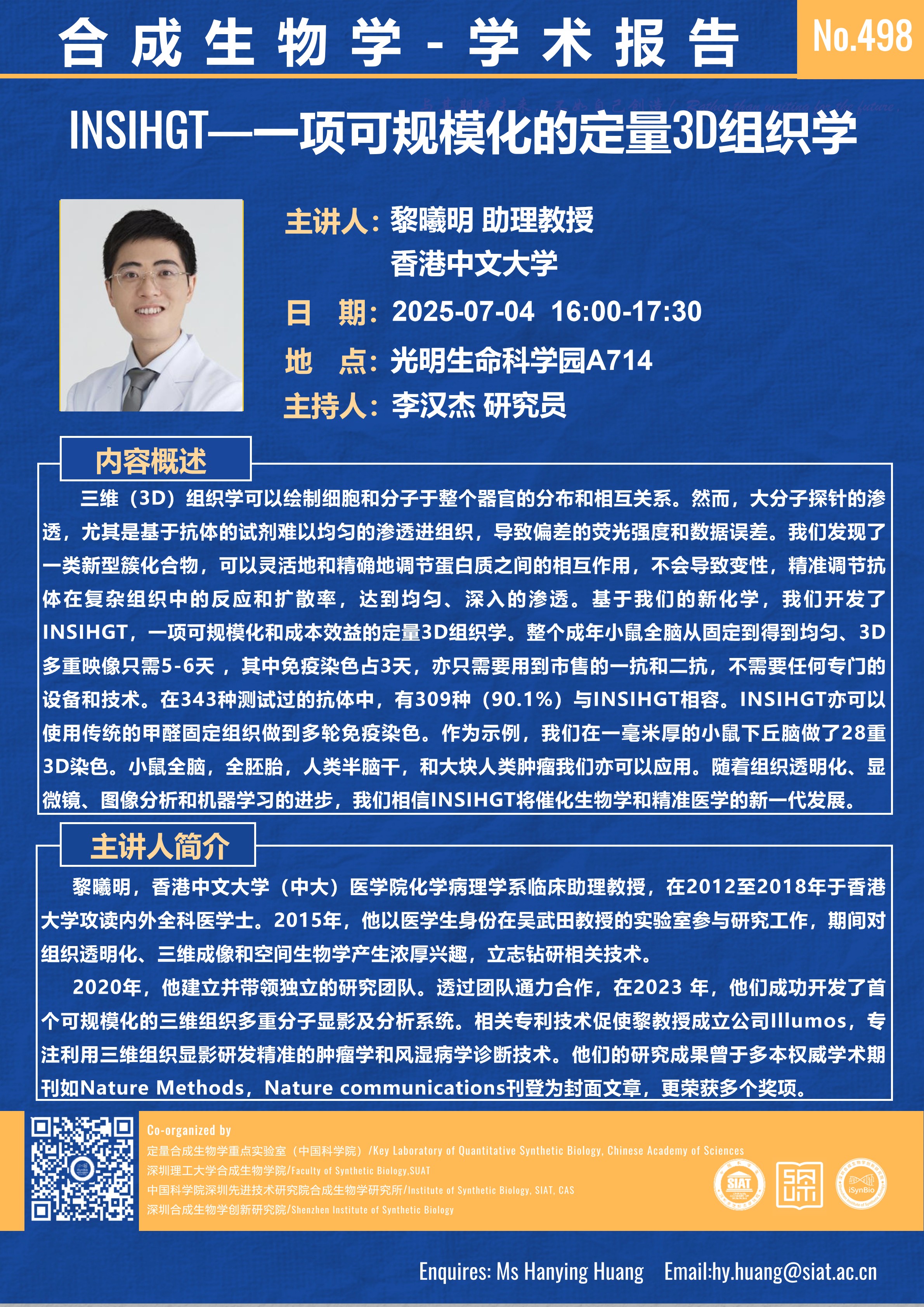 本次讲座邀请了 香港中文大学 黎曦明 助理教授 带来题为“INSIHGT—一项可规模化的定量3D组织学”的报告。