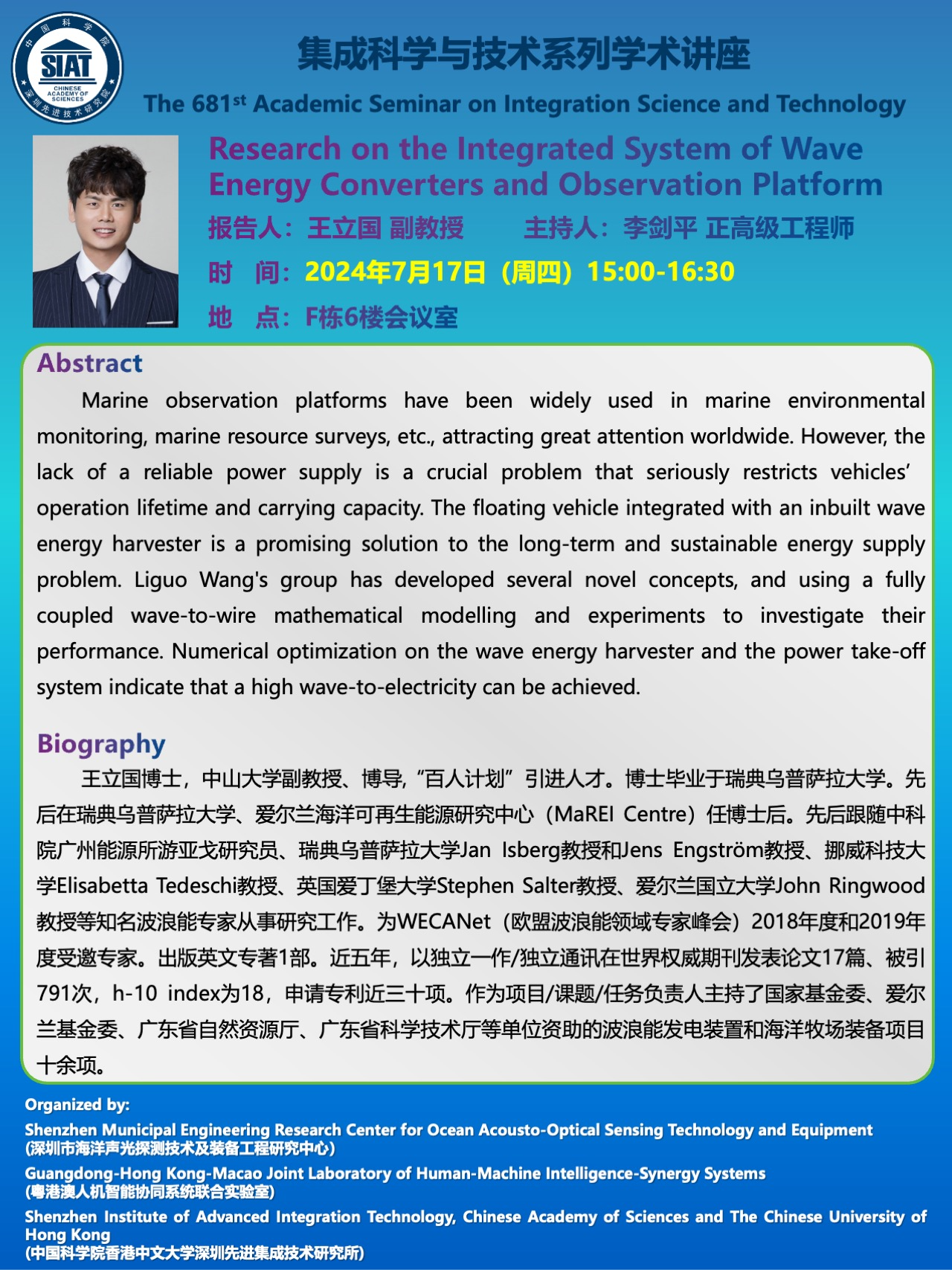 集成所 第681 期 集成科学与技术系列学术讲座将于  2025年7月17日(周四)15:00-16:30   在 F栋6楼会议室 召开,本次讲座特邀 中山大学 的 王立国 副教授  作题为《Research on the Integrated System of Wave Energy Converters and Observation Platform》的学术报告。