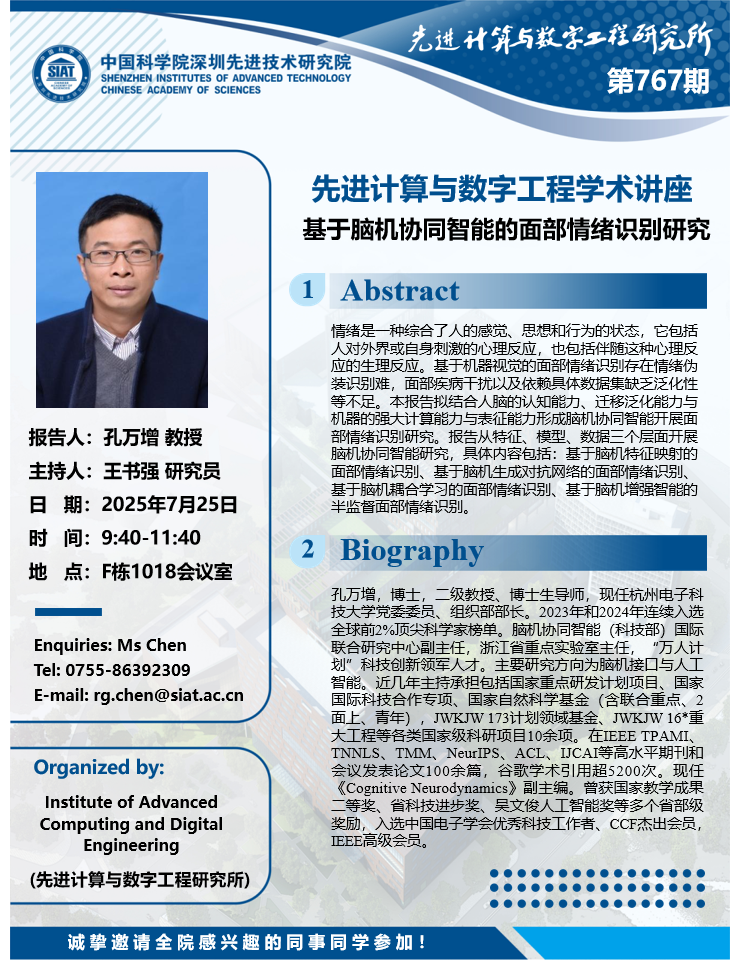 数字所/计算机学院第767期学术讲座将于7月25日9:40-11:40在F1018会议室举行,本次讲座将邀请杭州电子科技大学 孔万增 教授作题为“基于脑机协同智能的面部情绪识别研究”的报告。本次报告将由数字所 王书强 研究员主持,诚挚邀请大家参加、学习和交流!