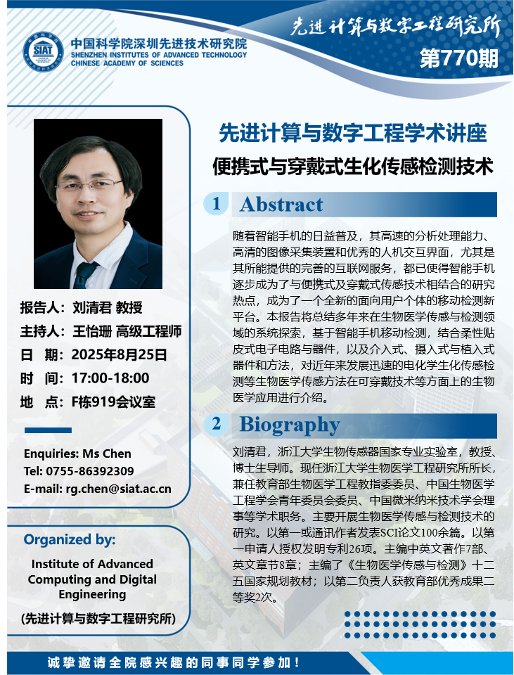 大家好!数字所/计算机学院770学术讲座将于8月25日17:00-18:00在F919会议室举行,本次讲座将邀请浙江大学 刘清君 教授作题为“便携式与穿戴式生化传感检测技术的报告。