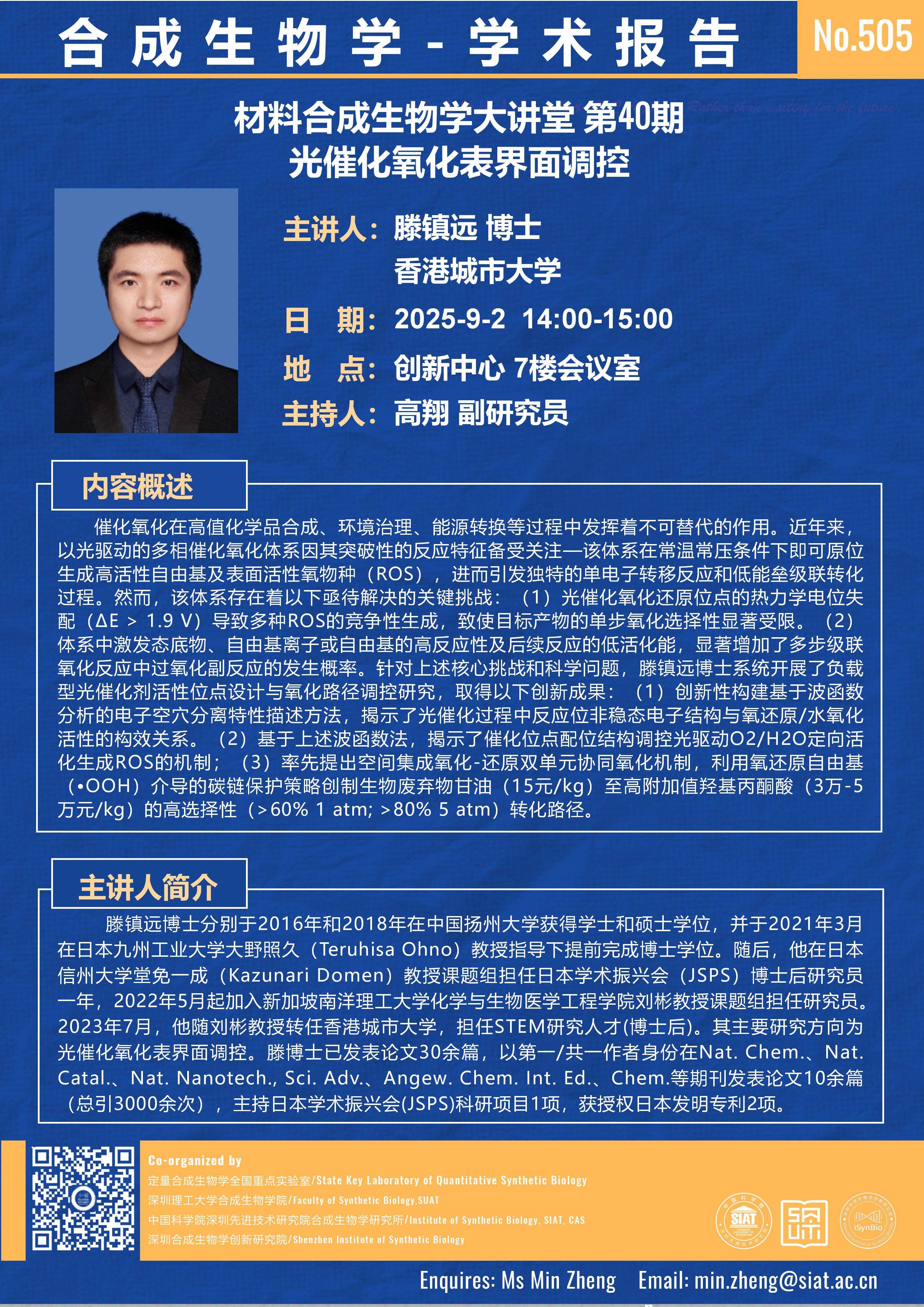 本次讲座邀请了 香港城市大学 滕镇远 博士 带来题为“光催化氧化表界面调控”的报告。