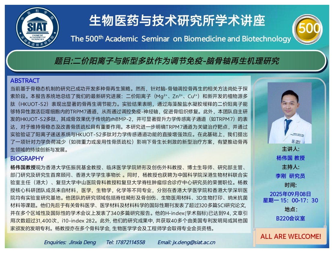 大家好! 医药所第500期学术讲座将于2025年09月08日 星期一 15:00-17:30 B220会议室举行。本次讲座邀请了来自香港大学 杨伟国 教授 带来“二价阳离子与新型多肽作为调节免疫-脑骨轴再生机理研究”的报告。届时,李刚 研究员将主持讲座。