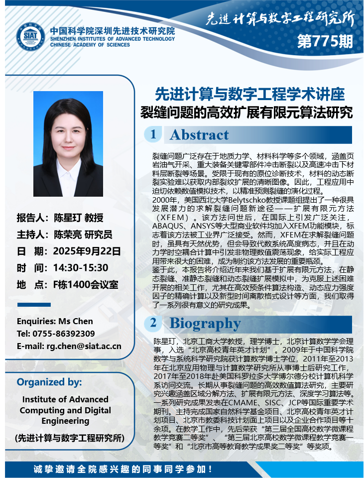 大家好!数字所/计算机学院第775期学术讲座将于9月22日14:30-15:30在F1400会议室举行,本次讲座将邀请北京工商大学 陈星玎 教授作题为“裂缝问题的高效扩展有限元算法研究”的报告。