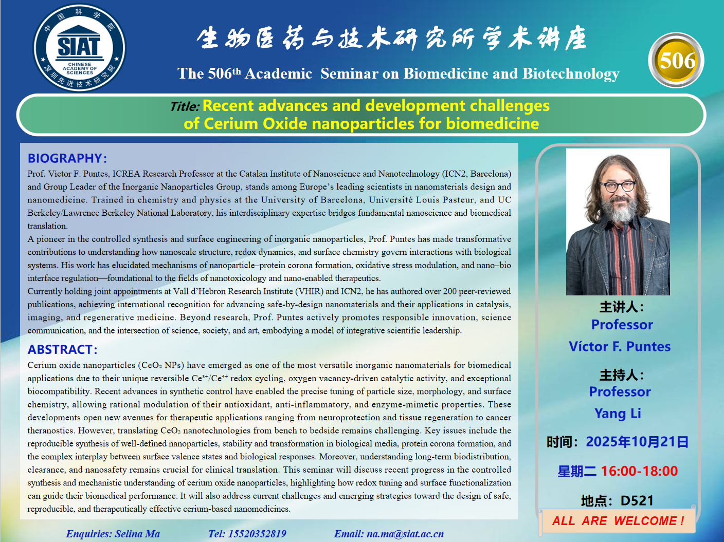 大家好! 医药所第506期学术讲座将于2025年10月21日 星期二 16:00-18:00 D521会议室举行。本次讲座邀请了来自西班牙加泰罗尼亚高等研究院(ICREA) Professor Víctor F. Puntes 带来“ Recent advances and development challenges of Cerium Oxide nanoparticles for biomedicine”的报告。届时,李洋 研究员将主持讲座。
