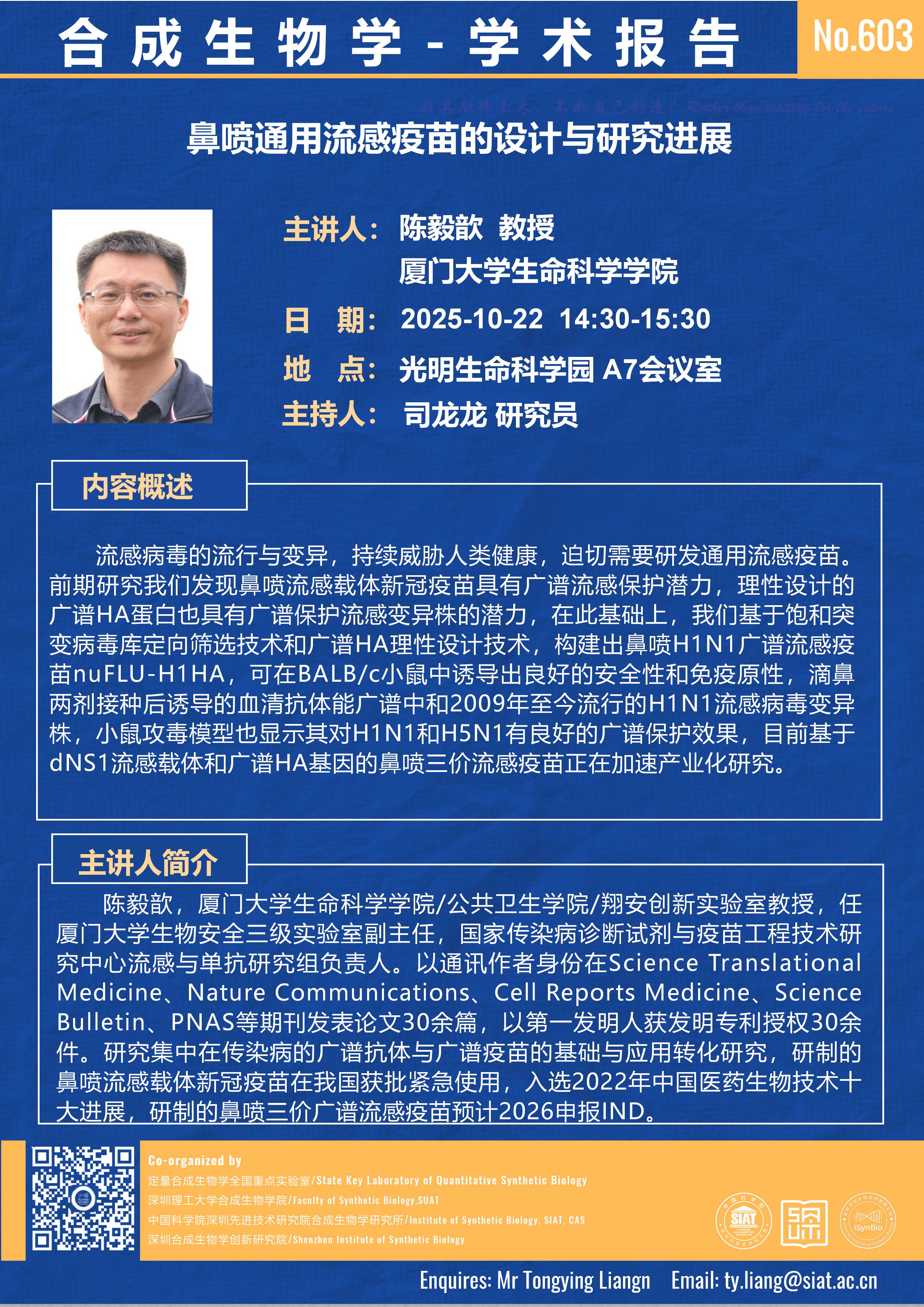合成所/合成生物学院第603期学术讲座将于 10月22日(星期三)14:30-15:30在 光明生命科学园 A7会议室举行。