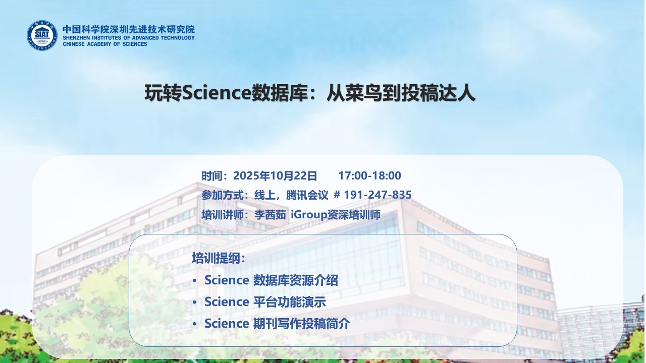 在科研竞争日益激烈的今天,如何高效利用全球顶尖学术资源,让你的研究成果脱颖而出?美国科学促进会(AAAS)出版的Science系列期刊,涵盖生命科学、工程技术、机器人学等多个前沿领域,是科研工作者不可或缺的学术宝库。本次讲座,我们特别邀请iGroup资深培训师李茜茹老师,带你深入探索Science数据库的强大功能——从数据库资源详解、平台高效检索技巧,到Science系列期刊的写作投稿秘籍,助你系统掌握从文献发现到成果发表的完整科研链条,全面提升你的学术竞争力。