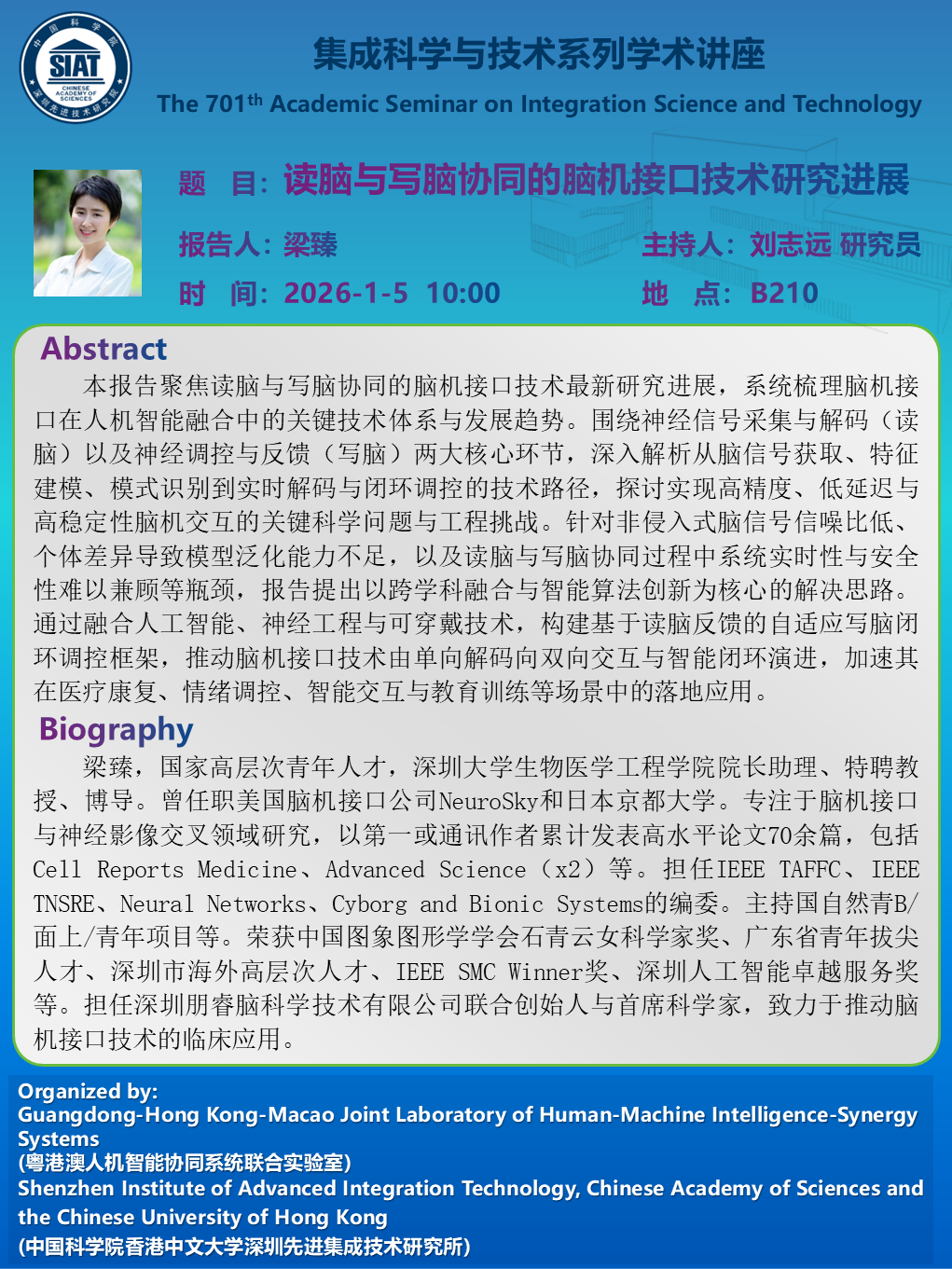 集成所第701期集成科学与技术系列学术讲座将于 1月5日(周一)上午10:00 在 B210会议室 召开。本次讲座特邀深圳大学的梁臻 教授作题为《读脑与写脑协同的脑机接口技术研究进展》的学术报告。