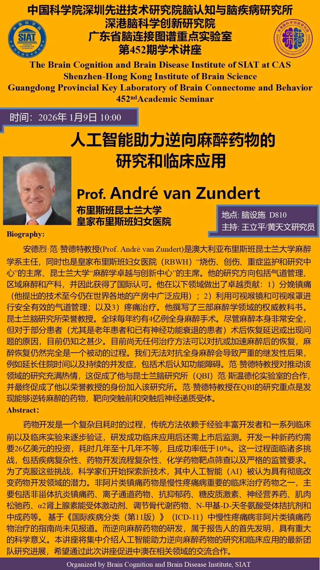 大家好!脑所/深港脑院将于1月9日(星期五) 10:00,地点:脑设施D810 会议室 举办第452期学术讲座。本次讲座邀请到‌布里斯班昆士兰大学/皇家布里斯班妇女医院的André van Zundert 教授,带来题为“人工智能助力逆向麻醉药物的研究和临床应用 ”的报告。