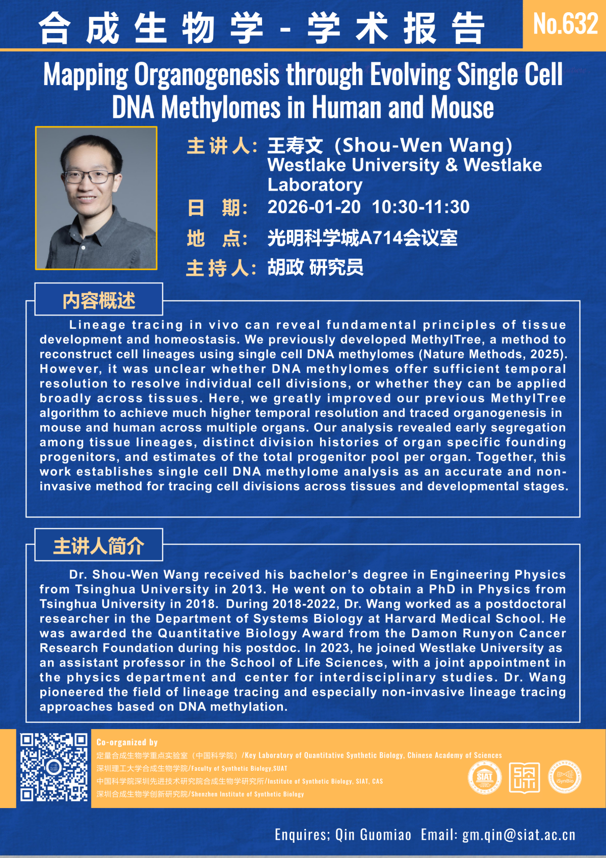 合成所/合成生物学院 第632期 学术讲座将于 1月20日 10:30-11:30 在 光明科学城A714会议室 举行。