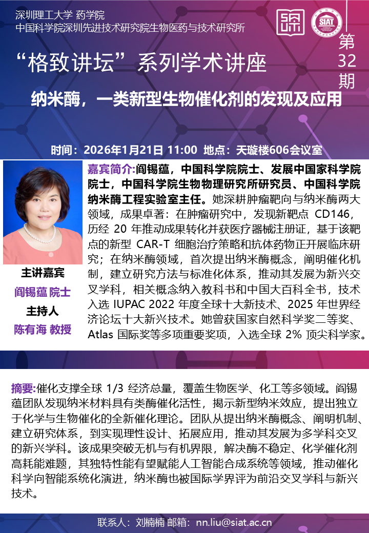 大家好!药学院/医药所“格致讲坛”系列学术讲座第32期将于2026年1月21日(周三)11:00,在深圳理工大学主校区天璇楼606会议室举行。本期讲座特邀中国科学院生物物理研究所的阎锡蕴 院士,带来题为“纳米酶,一类新型生物催化剂的发现及应用”的报告。届时,陈有海 教授将主持讲座。