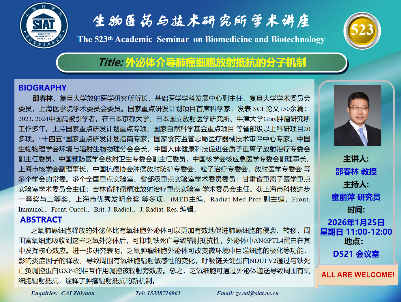 大家好! 医药所第523期学术讲座将于2026年1月25日 星期日 11: 00-12: 00 D521大会议室举行。本次讲座邀请了来自复旦大学放射医学研究所 邵春林 教授带来“外泌体介导肺癌细胞放射抵抗的分子机制”的报告。届时,童丽萍 研究员将主持讲座。
