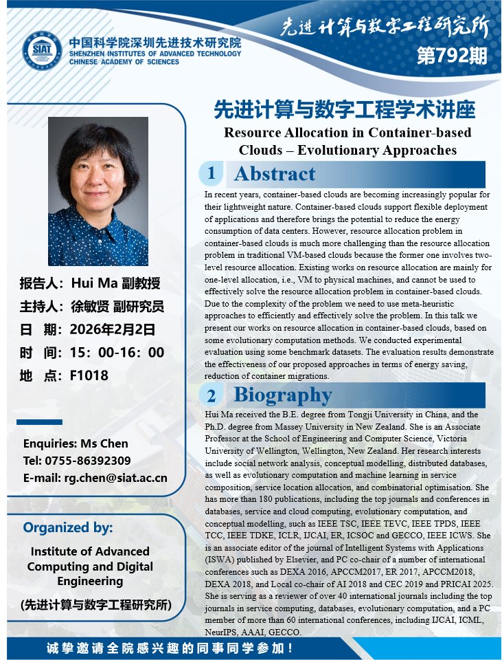 大家好!数字所/计算机学院第792期学术讲座将于2月2日15:00-16:00在F1018会议室举行,本次讲座将邀请新西兰惠灵顿维多利亚大学(Victoria University of Wellington, New Zealand) Hui Ma 副教授作题为“Resource Allocation in Container-based Clouds – Evolutionary Approaches”的报告。