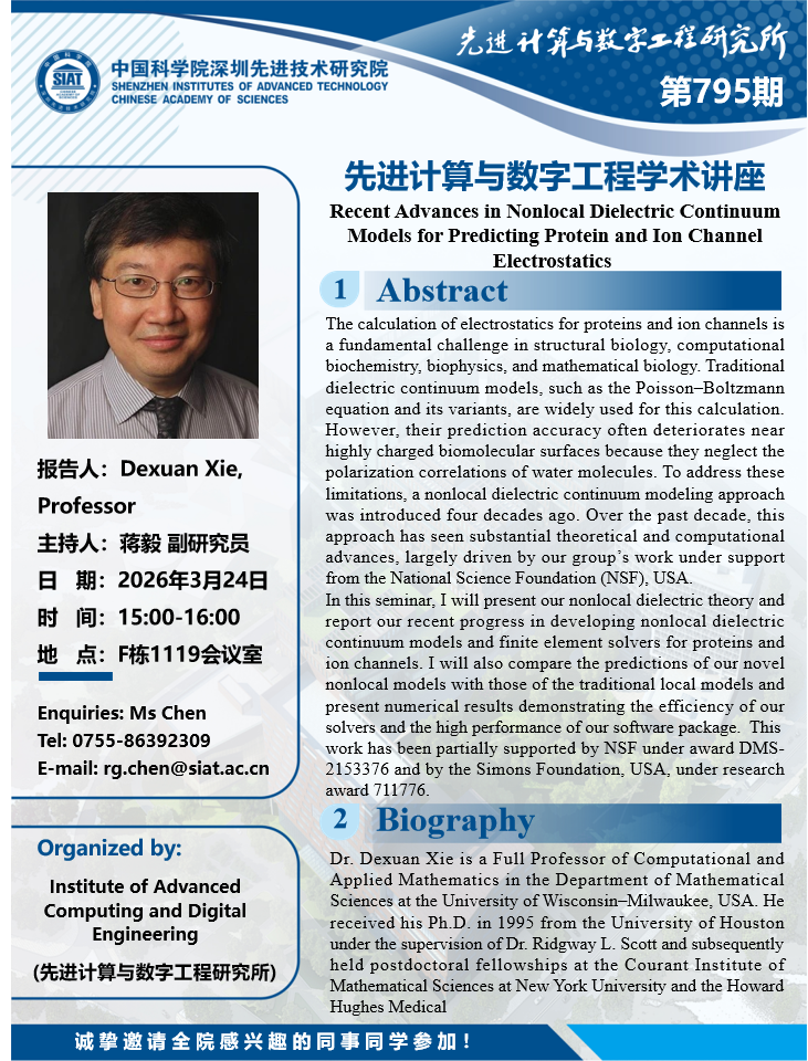 大家好!数字所/计算机学院第795期学术讲座将于3月24日15:00-16:00在F1119会议室举行,本次讲座将邀请University of Wisconsin–Milwaukee, USA(威斯康星大学密尔沃基分校)Dexuan Xie 教授作题为“Recent Advances in Nonlocal Dielectric Continuum Models for Predicting Protein and Ion Channel Electrostatics ”的报告。