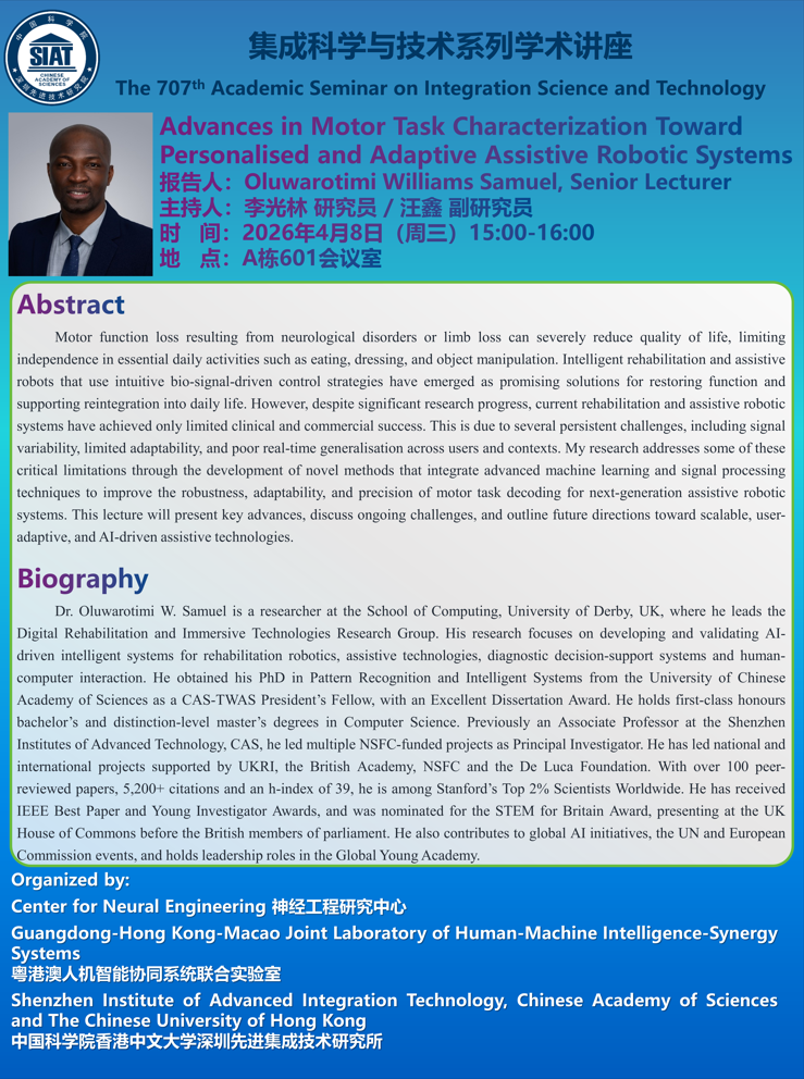 集成所第707期集成科学与技术系列学术讲座将于2026年4月8日(周三)15:00-16:00在A601会议室召开。本次讲座特邀University of Derby的Dr. Oluwarotimi W. Samuel作题为《Advances in Motor Task Characterization Toward Personalised and Adaptive Assistive Robotic Systems》的学术报告。