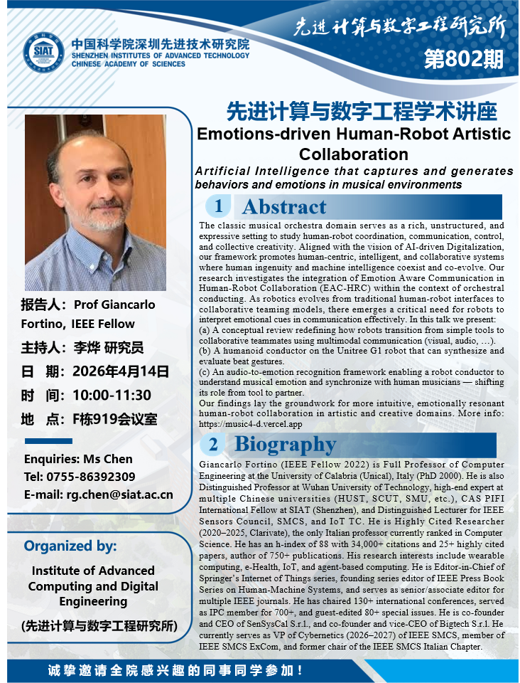 大家好!数字所/计算机学院第802期学术讲座将于4月14日10:00-11:30在F919会议室举行,本次讲座将邀请意大利卡拉布里亚大学(University of Calabria, Italy) Giancarlo Fortino 教授作题为“Emotions-driven Human-Robot Artistic Collaboration”的报告。