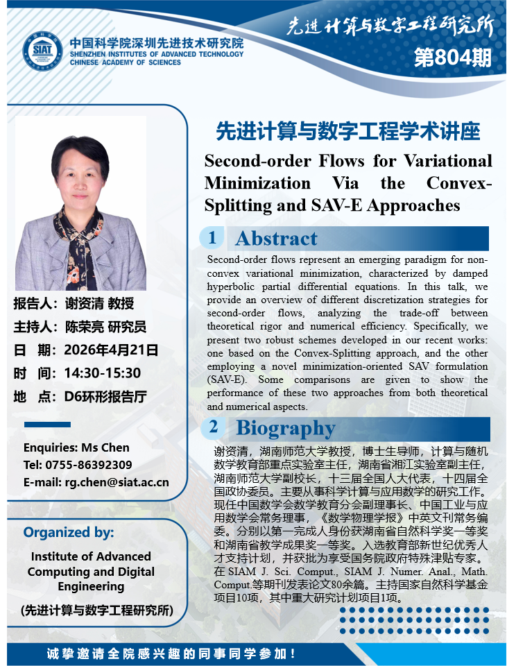 大家好!数字所/计算机学院第804期学术讲座将于4月21日14:30-15:30在D6环形报告厅举行,本次讲座将邀请湖南师范大学 谢资清 教授作题为“Second-order Flows for Variational Minimization Via the Convex-Splitting and SAV-E Approaches”的报告。