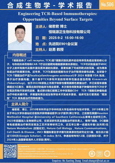 【2025年9月2日 合成所/合成生物学院】Engineering TCR-Based Immunotherapies: Opportunities Beyond Surface Targets