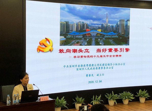 曹赛先作题为“敢向潮头立当好重要引擎”的专题报告,结合深圳40周年,紧扣《中共中央关于制定国民经济和社会发展第十四五个规划和2035年远景目标的建议》,从我国进入新发展阶段的重大意义、有利条件和重要特征出发,以2035年远景目标和“十四五”时期我国发展的指导方针、主要目标、重点任务为重点,牢牢把握住构建新发展格局的战略构想和重要着力点,深入解析十九届五中全会精神。实现“十四五”规划和2035年远景目标,必须坚持党的全面领导,充分动员各方面力量并为之团结奋斗。今年是深圳经济特区建立四十周年,以此为契机,深圳被党中央赋予了新时代的历史使命,实施综合授权改革试点。深圳市作为重要引擎,要积极作为深入推进粤港澳大湾区建设,建机制、出方案、抓要点、见行动,推动深圳改革开放再出发,建设好中国特色社会主义先行示范区。