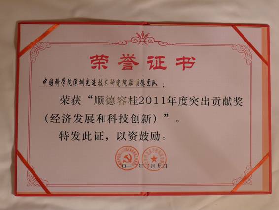 2月9日,千亿大镇—广东省顺德市容桂镇举行2011年度突出贡献奖颁奖典礼,中科院深圳先进院CAE团队作为唯一非容桂单位,获得经济发展与科技创新领域突出贡献奖,与格兰仕、海信科龙、伊之密等企业同获此殊荣。