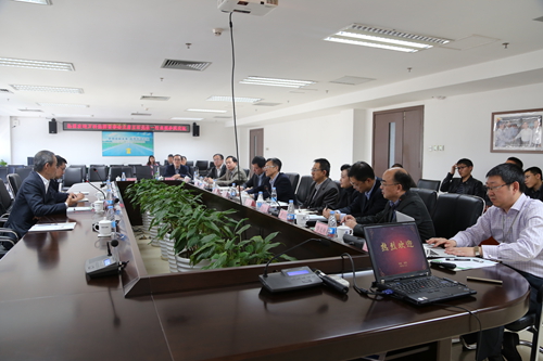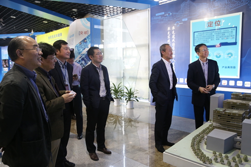 先进院院长樊建平(右一)向万科集团创始人、董事会主席王石(前排右二),建筑研究与工程采购中心副总经理时宇(前排右三)介绍院情