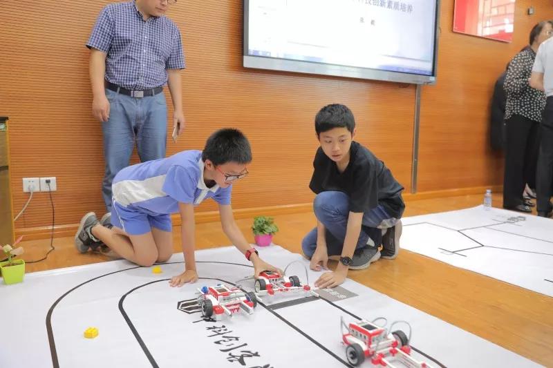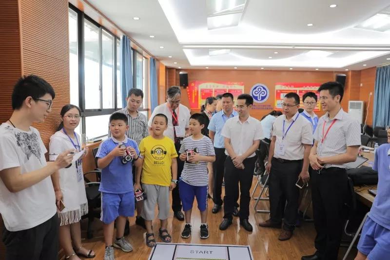 会议结束后,中科先进院实验学校为与会嘉宾们增设了一个特殊的观摩体验环节——粤港澳大湾区比赛展示。9名实验学校的学生应邀来到会议室进行创造力比赛的模拟展示。他们3人一组,在指导老师的指示下迅速铺开实验图纸,现场调试并确认了程序后就开始了比赛。为了呼应本次“环保”的比赛主题,3组小队员分别参与的是“电力恢复”“垃圾分类”“动物救助”等项目,两轮比赛结束后,指导老师随即公布了各位队员的得分及排名并进行了点评。看着孩子们机智聪慧的设计以及展现出来的团结协作的精神,在场的领导老师们纷纷为同学们点赞。