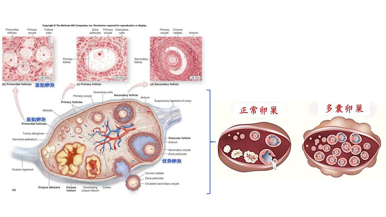 △正常卵巢与多囊卵巢的模式图(摘自网络)