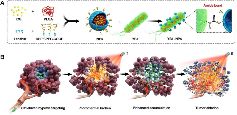 自然界中细菌无处不在、种类繁多。一些细菌具有肿瘤趋向性、组织穿透性等优势使得其成为靶向实体瘤的潜在新载体。但是,活细菌应用于肿瘤治疗仍然存在着疗效和毒性难以平衡的问题。随着合成生物学的兴起,课题组利用工程化改造的肿瘤靶向沙门氏菌YB1作为载体,并通过共价交联的方式将包载ICG的磷脂聚合物纳米光敏剂(INPs)连接在工程菌YB1表面。这种细菌驱动的递送策略能够将INPs高特异性地靶向传递到肿瘤缺氧核心,同时利用INPs的荧光实时成像性能和光热高效转换能力,使得能够对肿瘤内的YB1-INPs精准光热干预。