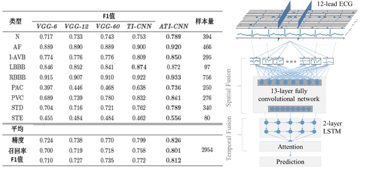 针对上述问题,研究人员提出了一种基于时空特征融合的深度网络架构,有效提取了信号的空间和时间特征,突破了传统方法对心电信号时间空间特性同时描述的不足。研究人员进一步在网络架构中引入注意力机制,对分段信号的重要性进行自适应评估,有效提高了模型对异常状态的感知,降低了其它信息的干扰。上述方法实现了以房颤、传导阻滞、早搏等为代表的9类心律失常疾病的有效判别,在2018中国生理信号挑战赛公开的9831条心电信号上(约609,522个心搏),心律失常识别精度达到82.6%(详见图1)。