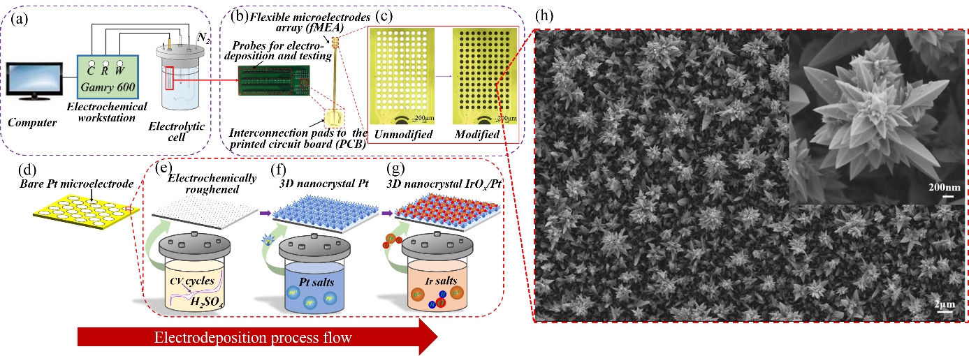 图1(a)电化学修饰装置示意图;(b)微电极阵列排布;(c)微电极表面修饰前后的光学显微图像;(d)-(g)微电极表面修饰流程图;(h)氧化铱/铂纳米材料微观形貌
