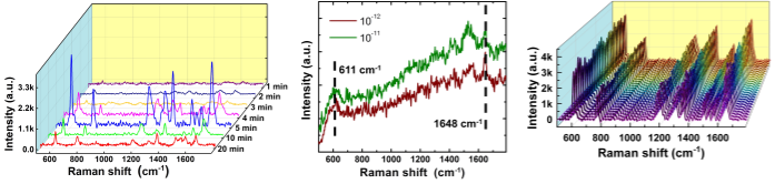 图二 基于自组装SnSe2 纳米片阵列的SERS基底具有超低的检测极限(1×10-12 M), 高增强因子(1.33×106)和极好的均匀性(相对标准偏差降至7.7%)。