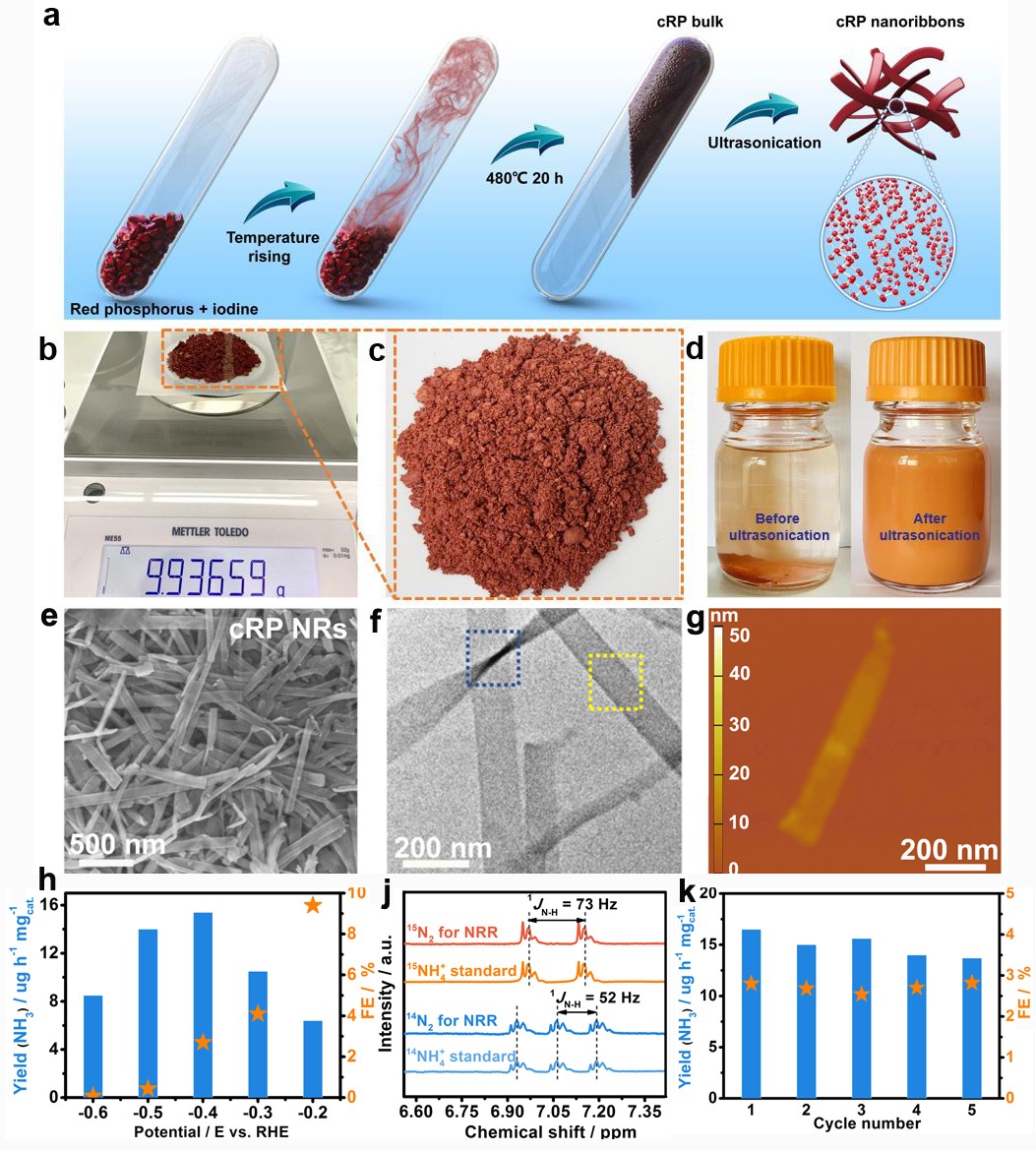图:(a)晶态红磷块体及纳米带制备流程图;(b,c) 10克晶态红磷样品;(d) 超声前后样品的照片;晶态红磷纳米带: (e) 扫描电镜图;(f) 透射电镜图;(g) 原子力显微镜图;(h-k) 电化学固氮性能数据图。