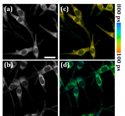 (a)-(b) 荧光强度图;(c)-(d) 荧光寿命标记图。