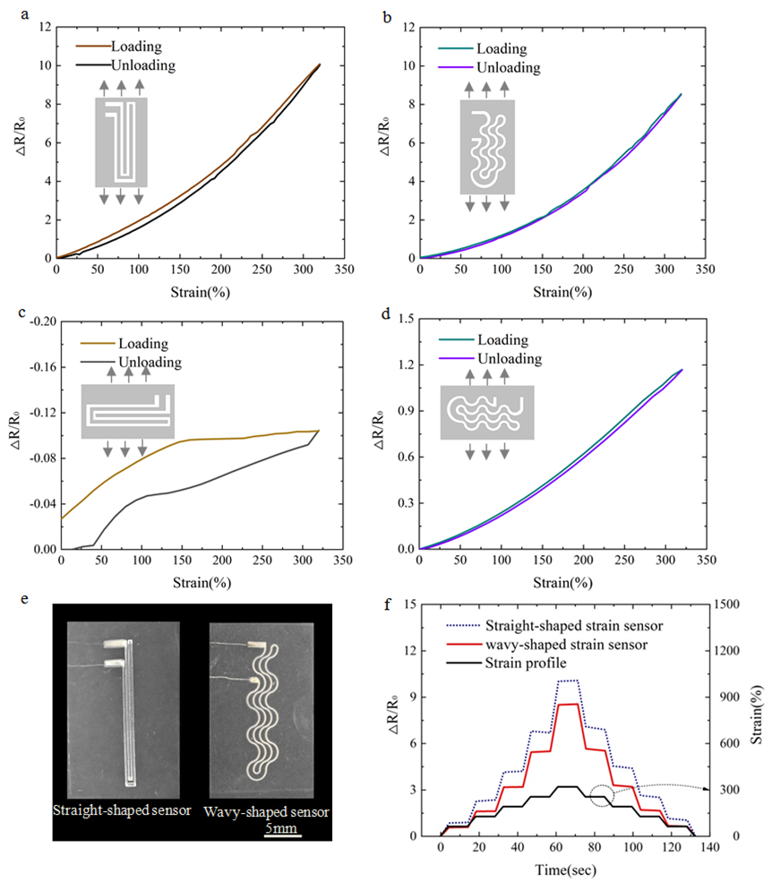 图1:直线型微通道传感器和波浪形微通道传感器的响应曲线对比。(a,c)直线型应变传感器和(b,d)波浪形应变传感器的相对电阻分别在纵向和横向负载下的变化;(e)直线型应变传感器和波浪形应变传感器结构;(f)直线型应变传感器和波浪形应变传感器在连续分布加载实验中的响应曲线变化。