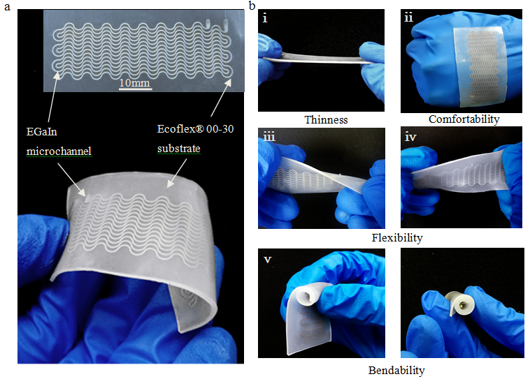图2:(a)增强的波浪形微流体应变传感器结构。(b)增强的波浪形微流体应变传感器表现出良好的适形性,柔韧性和可弯曲性。