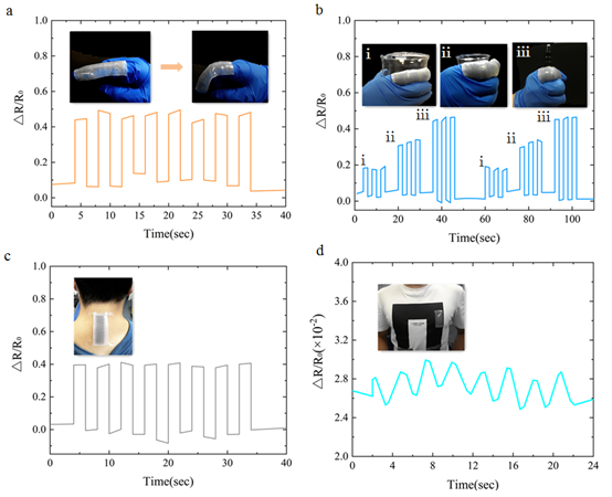 图3:增强的波浪形应变传感器作为可穿戴设备实时监测人体和机器人的运动状态。(a)人体手指弯曲/舒展时的信号响应;(b)贴敷有传感器的手指在抓取不同尺寸物体时的信号相对变化(1)烧杯;(2)塑料杯;(3)圆珠笔;(c)增强的波浪形传感器在人体颈部弯曲和(d)胸腔呼吸等动态循环加载下的输出信号变化。(e)集成在机器人运动关节上的柔性传感器随机器人不同运动状态的响应曲线。