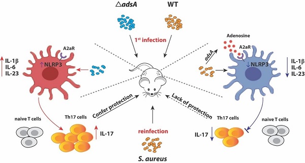 腺苷合成酶A通过抑制保护性的Th1和Th17免疫反应,而导致金葡菌的反复感染机制。