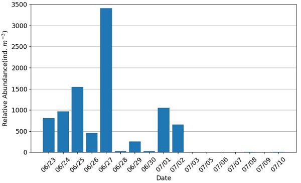 在四年时间里,李剑平团队历经四期累计15天以上的近岸海试后,于2020年6月22日将成像仪系统集成至水面浮标,并部署于深圳大亚湾海域。通过采取多项防生物附着措施,于2021年2月25日成功回收。在此次长达8个月的连续海试中,仪器成功获取了该海域浮游生物丰度变化的时间序列数据,观测到了浮游动物的昼夜垂直迁徙现象、优势种的动态变化,并成功监测到了大亚湾海域首次记录的尖笔帽螺暴发。上述海试结果展示证明了团队研发的海洋浮游生物观测系统能够提供更全面及时的浮游生物监测信息,有望成为海洋浮标观测平台的一种新工具。