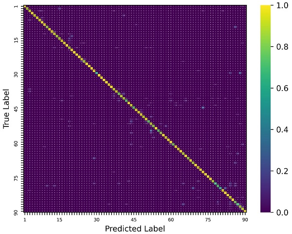 图4 深度学习分类算法在90类分类测试中的查全率结果混淆矩阵