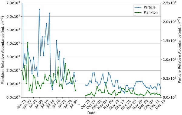 图5 2020年6月23日至12月15日浮标海域总颗粒物和总浮游生物相对丰度时间序列