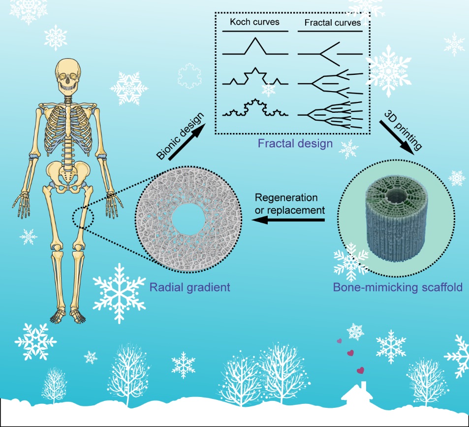 近日,中国科学院深圳先进技术研究院医药所退行性中心的阮长顺、潘浩波和哈尔滨工业大学富宏亚多团队交叉协作,提出一种可用于挤出式3D打印的仿天然骨组织“松质骨-皮质骨”径向连续孔隙调控的骨组织工程支架构筑策略,将分形学理论结合骨组织工程支架生物制造中,克服了传统挤出式3D打印技术难以实现径向梯度孔隙结构的困难。