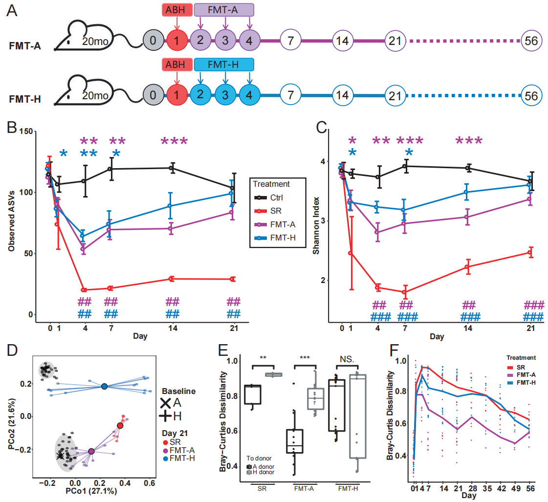 研究人员使用自然衰老的小鼠(20月龄)作为FMT受体来研究移植的肠道菌群的建立及其恢复力。首先,用抗生素混合物处理老龄小鼠以破坏肠道菌群,并监测其自行恢复(spontaneous recovery, SR)过程。研究发现,抗生素处理对肠道菌群多样性和组成的影响持续至处理后 8 周。
