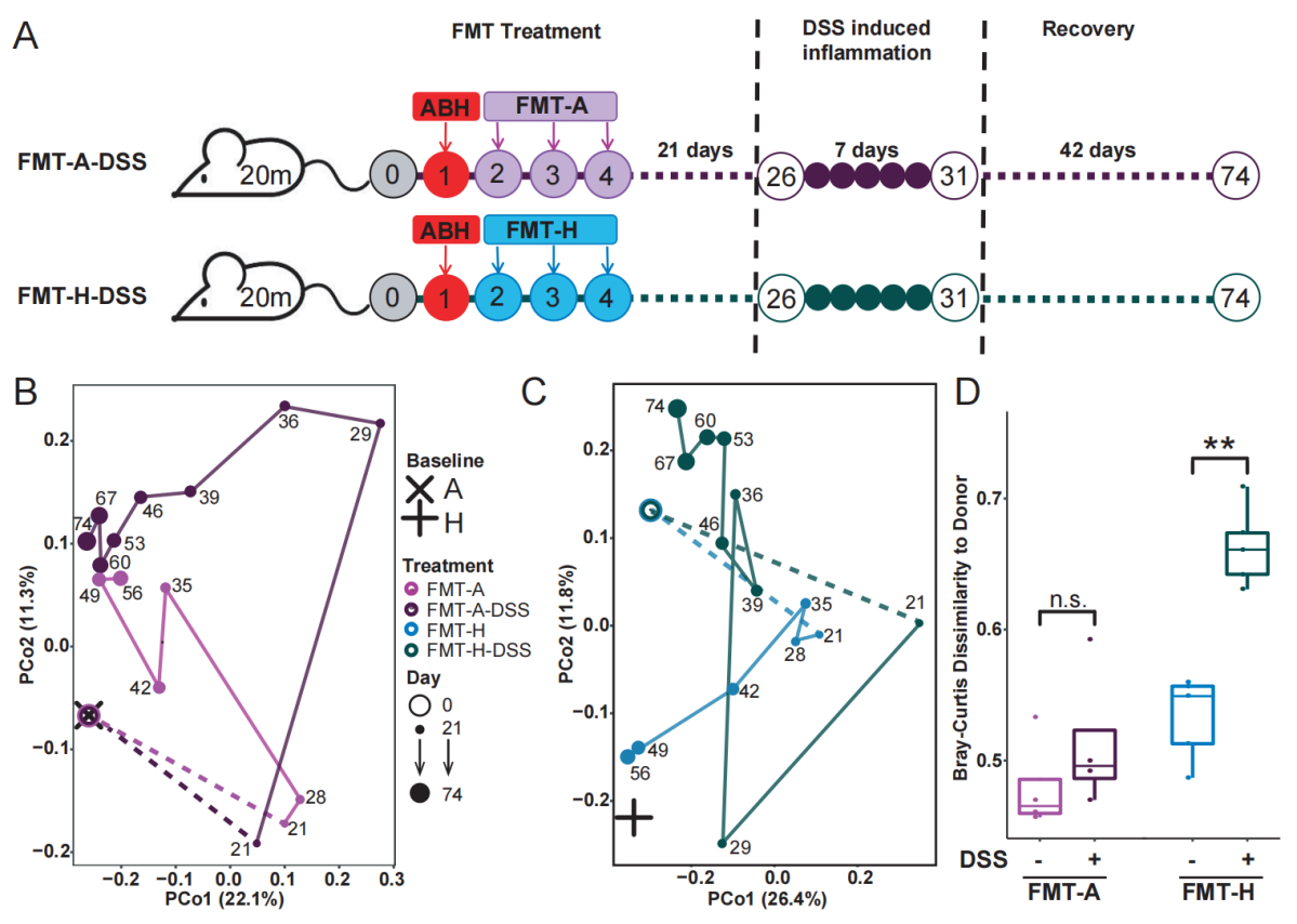 最后,研究人员对接受自体或异体FMT后的小鼠使用化学物质(葡聚糖硫酸钠,DSS)诱发结肠炎症,引起对新建立的肠道菌群稳态的再次扰动(图2A)。对于接受自体移植的老龄小鼠,肠道菌群的恢复过程仅被诱导的炎症短暂地扰动,第 53 天后的无论是诱发肠炎的受体鼠(FMT-A-DSS组)还是移植后没有诱发肠炎的受体鼠(FMT-A组)其肠道菌群组成均相似(图 2B),与老年供体的距离没有显着差异(图 2D)。相反,异体移植所建立的肠道菌群则无法在扰动后维持其组成,异体移植后接受肠炎诱导的小鼠(FMT-H-DSS)其菌群组成逐渐恢复到了移植前老龄小鼠原始的菌群稳态(图2C),与仅接受异体粪菌移植(FMT-H组)小鼠相比其菌群组成明显偏离其供体(图 2D)。