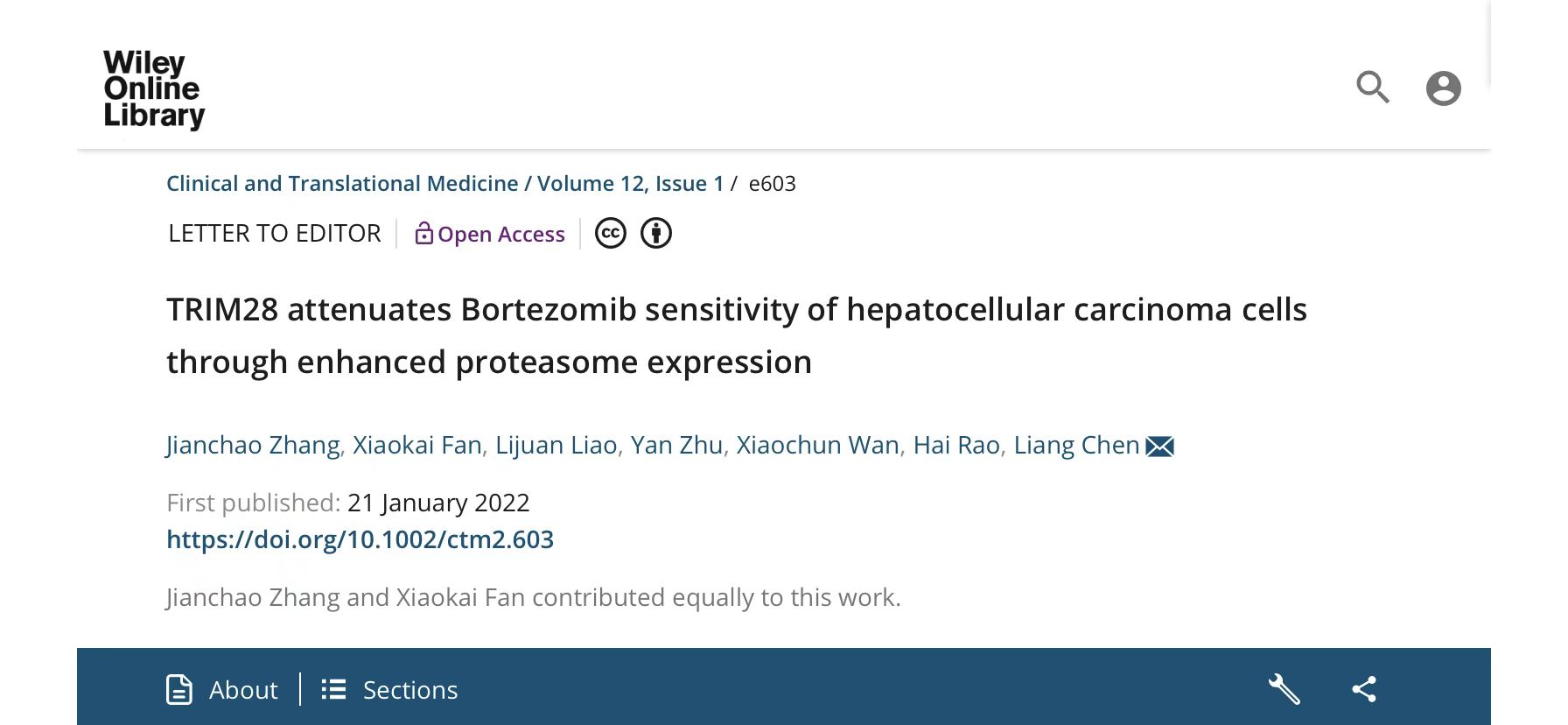 近日,中国科学院深圳先进技术研究院医药所蛋白药物中心陈亮课题组在肝癌药物敏感性研究方面取得重要进展。相关论文TRIM28 attenuates Bortezomib sensitivity of hepatocellular carcinoma cells through enhanced proteasome expression(TRIM28通过增强蛋白酶体表达减弱肝癌细胞对硼替佐米药物的敏感性)于1月21日在线发表于Wiley旗下期刊Clinical and Translational Medicine(IF=11.49)(DOI: 10.1002/ctm2.603)。论文第一作者是陈亮课题组硕士研究生范晓恺以及南方科技大学研究助理教授张建超。