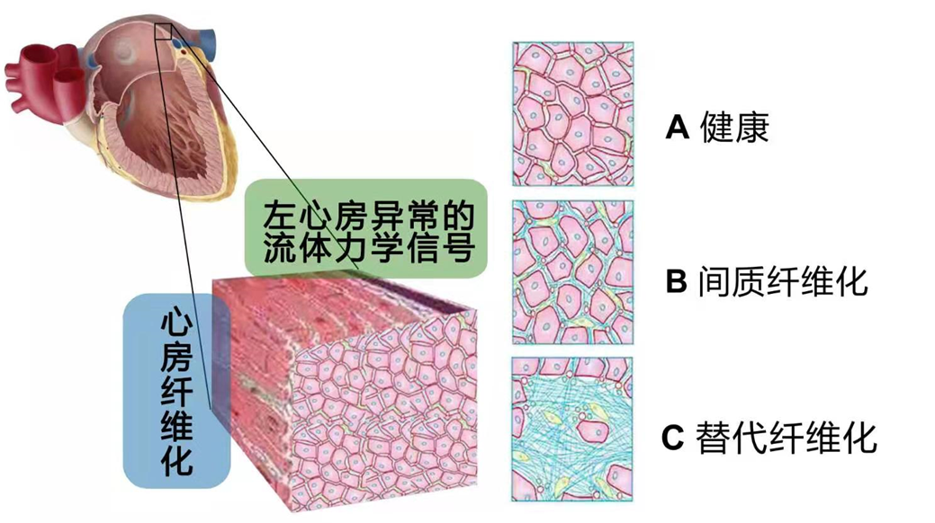 图2 左心房异常的流体力学信号导致心房纤维化的发生,A健康状态,B间质纤维化状态,C 替代纤维化状态。