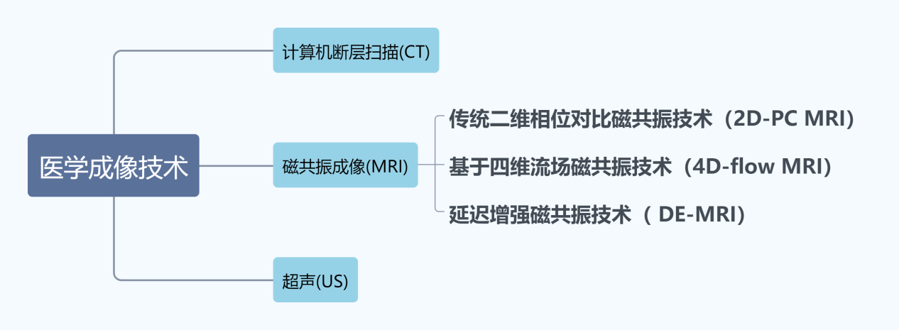 近年来基于四维流场磁共振技术(4D-flow MRI)技术的问世,使得对于在体大血管及与心腔内血液流体力特性的学研究有了质的飞跃。与传统的二维相位对比磁共振技术(2D-PC MRI)相比,4D-flow MRI通过测量三个方向的流速编码和单向的流动补偿编码来进行四点扫描,从而获取图像信息。在三个空间维度中的每一个具有速度信息的时间分辨3D成像已经证明了心脏内流量定量的可靠性和准确性。相比于2D-PC MRI,4D-flow MRI 可以对流体体积定量,且有更好的可重复性,多种流体参数据,可以更好的进行回顾性分析。目前4D-flow MRI可视化方法已经有效地识别了诸如主动脉,颈动脉、脑血管患者左心房内的各种管腔中的血流异常变化,精确的计算出血管及心腔内不同区域流场的速度,流体力学方向,以及局部血管壁所承受的血流剪切应力。