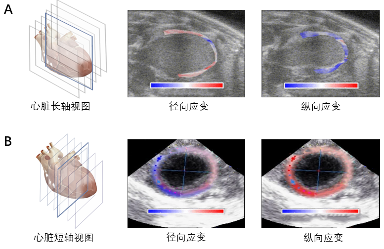 RTE测量方法。实验动物均常规建立静脉通道,麻醉状态下且给予心电监护。肌形变显像在客观评价心室功能的基础上,对获得有临床价值的信息具有重要作用。实时超声弹性成像技术(RTE)是一种利用超声射频数据提取心肌局部变形场的心肌变形成像方法。RTE利用心肌的自然收缩和松弛作为应变估计的机械刺激。如图6所示,A心肌的径向和纵向应变可视化结果,B心肌的轴向应变可视化结果。