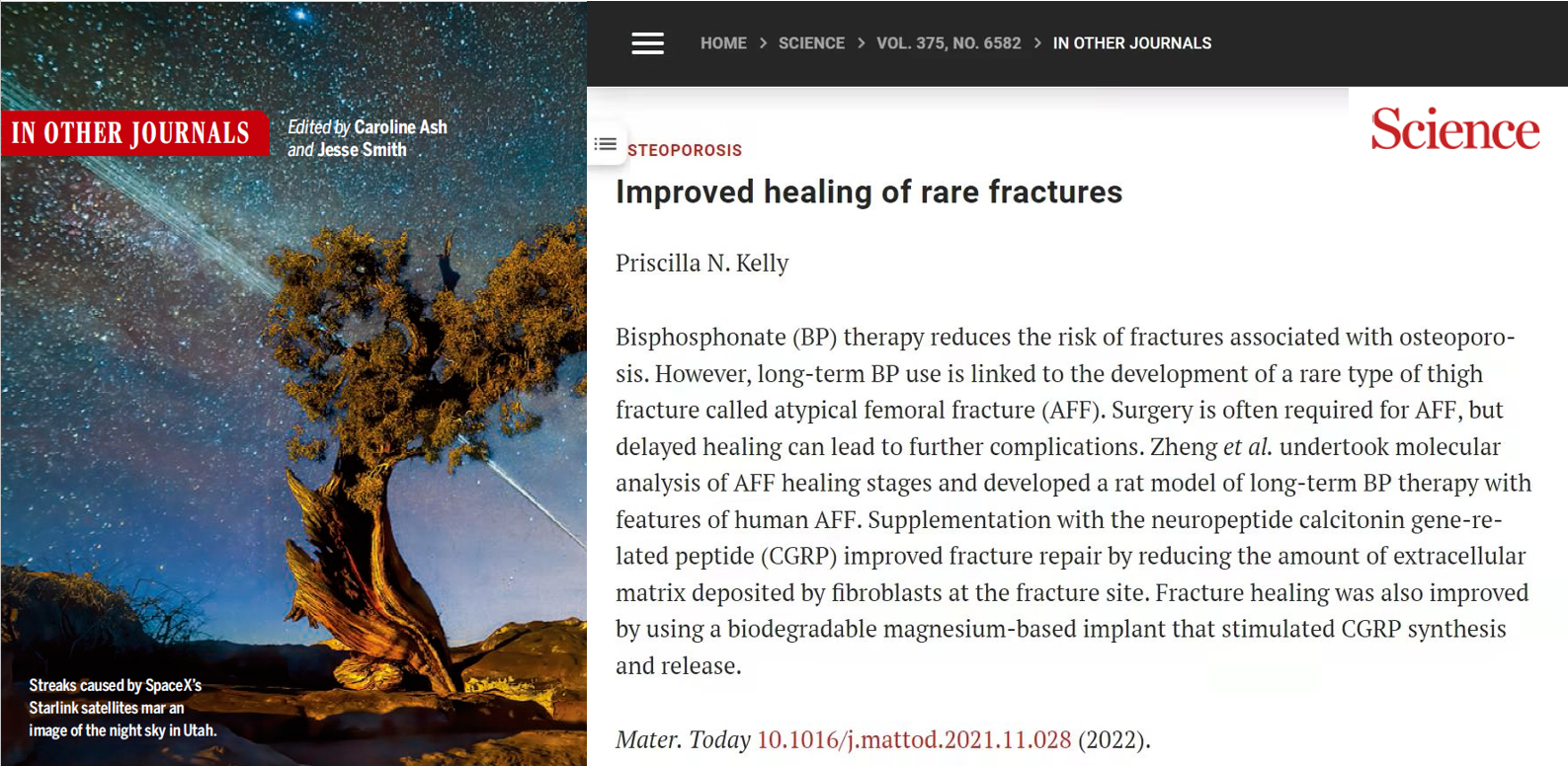近日,香港中文大学/中国科学院深圳先进技术研究院医工所转化医学研究与开发中心秦岭教授团队和圣路易斯华盛顿大学的RegisO’Keefe团队联合在Material Today (IF = 31) 杂志上发表了题为“Magnesium Facilitates the Healing of Atypical Femoral Fractures: A Single-cell Transcriptomic Study”的原创研究论文。2月17日被Science杂志以“Improved healing of rare fractures”为题进行Research Highlights报道。论文第一作者是郑念野、许建坤,深圳先进院转化医学研究与发展中心主任秦岭为该文通讯作者。