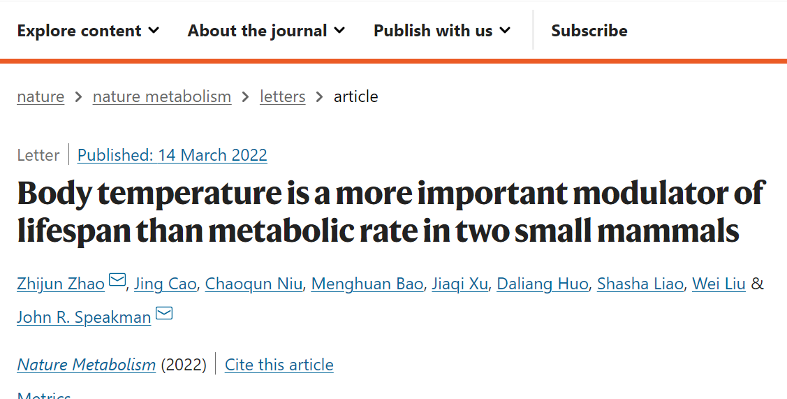 北京时间3月15日凌晨,中国科学院深圳理工大学(暂定名,以下简称“深理工”)药学院讲席教授、中国科学院深圳先进技术研究院医药所能量代谢研究中心首席科学家约翰·罗杰·斯彼克曼(John Roger Speakman)团队联合温州大学赵志军教授团队、聊城大学、英国阿伯丁大学等单位的合作成果发表于《自然—代谢》(DOI:10.1038/s42255-022-00545-5)。该研究成果厘清了代谢率与体温对寿命的影响,揭示了在特定条件下,体温对寿命的影响更大。赵志军为本文第一作者,赵志军和John Speakman教授为共同通讯作者。温州大学为第一署名单位,合作单位为聊城大学、中科院深圳先进技术研究院、Aberdeen University of UK、中科院遗传与发育生物学研究所。本项工作得到了国家自然科学基金委面上基金等项目的资助。