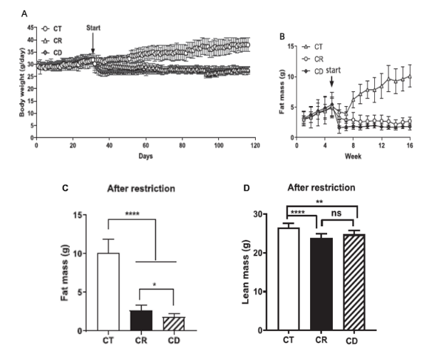 实验中,对CD组小鼠饲喂含有50% 纤维素的食物,CR组小鼠被投喂与 CD 组相同能量的普通正常食物。相对于正常饮食的小鼠,两种不同模式的CR小鼠体重均出现了快速明显下降,具体表现为体重下降和体内脂肪含量的降低,相比传统意义的CR来说,CD小鼠脂肪质量下降更为显著。(图1)