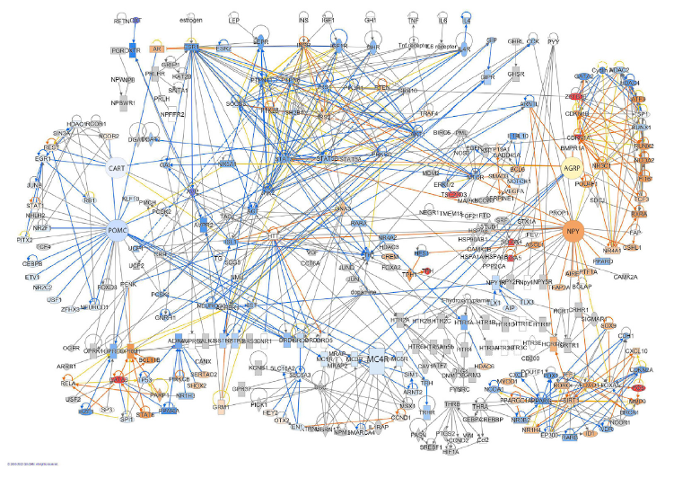 随后,研究团队利用RNA-SEQ进一步对两组限制组及对照组小鼠的下丘脑基因表达谱进行了分析研究,通过对比两种不同模式的CR,发现两者主要的区别在于小鼠在饥饿状态下一些与饥饿通路相关的基因表达改变,比如下调酪氨酸羟化酶D5受体(多巴胺受体)的基因表达。CR 和 CD 组之间并没有发现相关神经肽表达的差异,尽管两组相对于CT组,它们都显示出促食欲神经肽 NPY 和 AgRP 的基因表达增加,并且 POMC 和 CART 的水平降低。但是两者也存在相对细小的差异,我们发现16 个基因在CR 里相对于 CD上调,同时还有另外16 个基因相对下调。但CR相对于CD的上调基因里包括许多在饥饿时表达会增强的基因如Hif3、Tsc22d3、pdk4、 fmo2等等(图3)。这些结果表明尽管摄入相同能量,CR 小鼠确实比 CD 小鼠更饿。该基因表达谱的结果与之前观察到的他们的动物行为相符合。